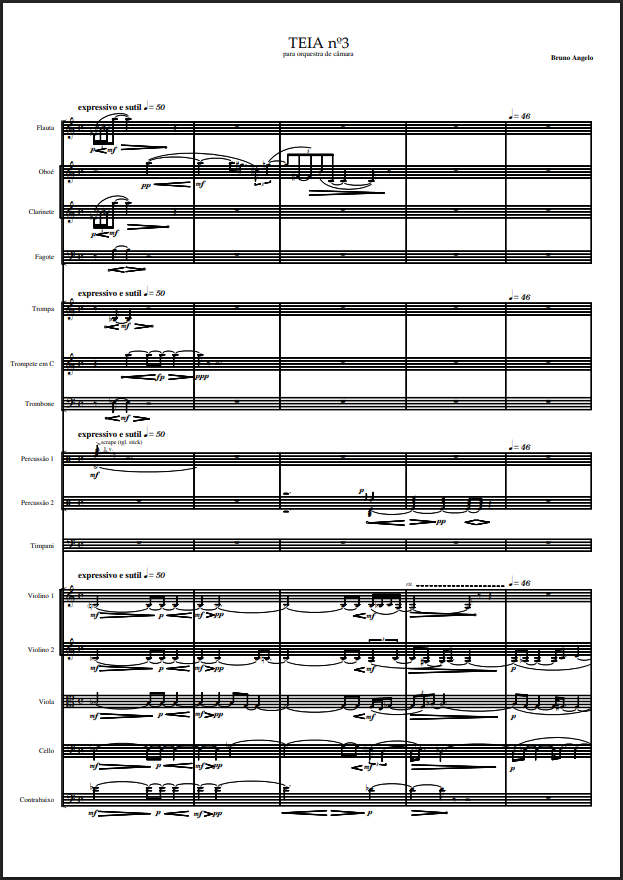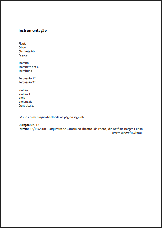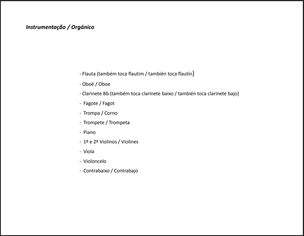 Instrumentação: flauta transversal, 2 clarinetes em si bemol, sax alto, sax tenor, sax barítono, trompa em fá, 3 trompetes em si bemol, trombone, eufônio, tuba, baixo elétrico, percussão (tamborim/pandeiro) e bateria.